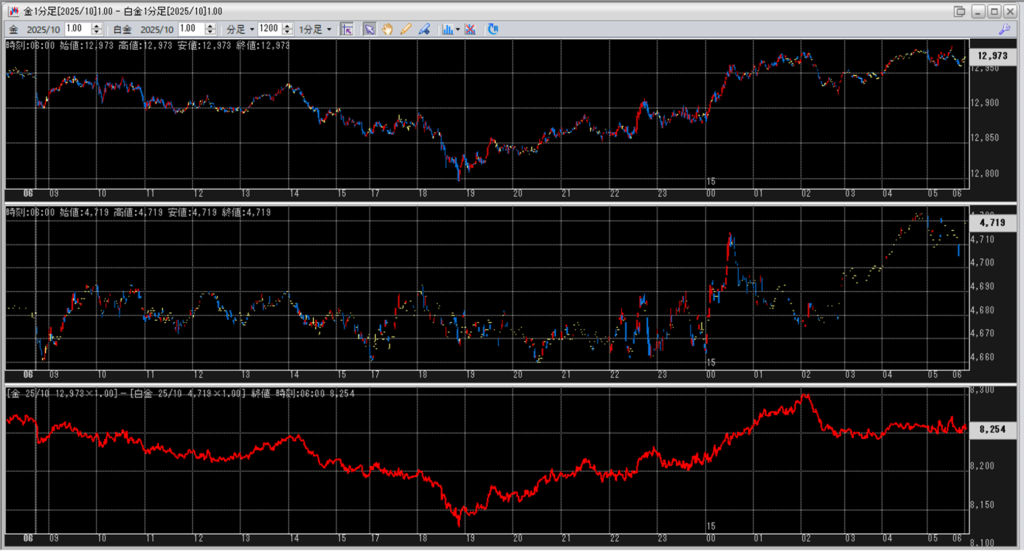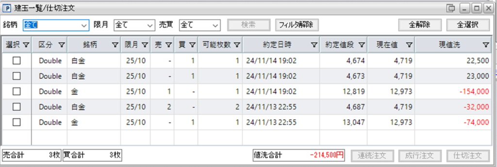 この鞘縮小の仕掛け金売り1枚-白金買い2枚がほぼ底で仕掛けてしまっています。