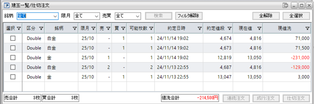 鞘縮小の仕掛け金売り1枚-白金買い2枚を1組を保持しています。