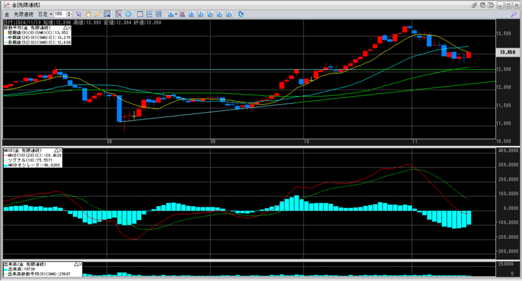 移動平均線の真ん中に位置している短期線13,052円を割り込んで、