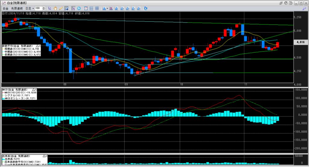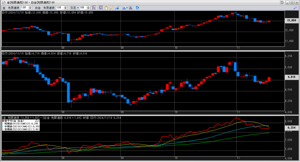 下記に金白金鞘の移動平均線のチャートを貼り付けています。