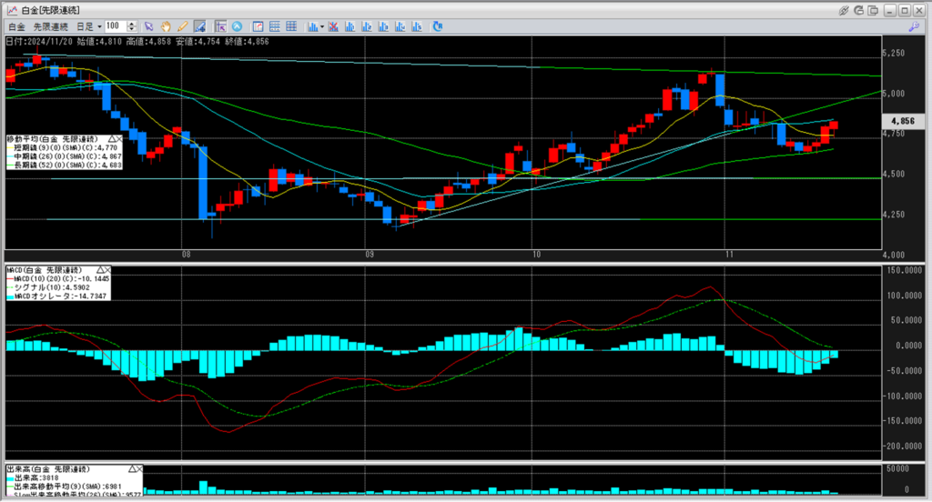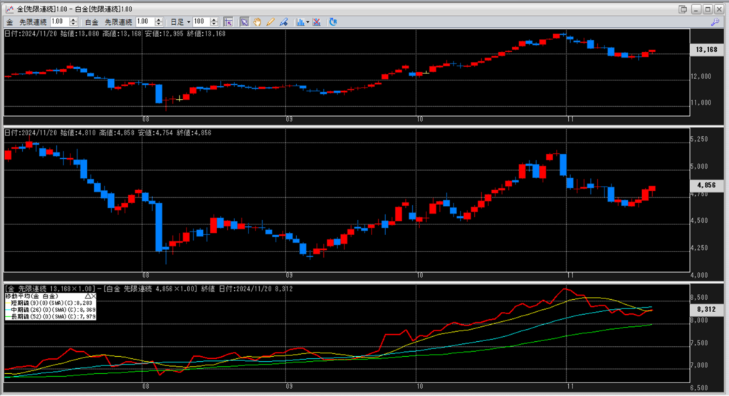 下記に金白金鞘の移動平均線のチャートを貼り付けています。