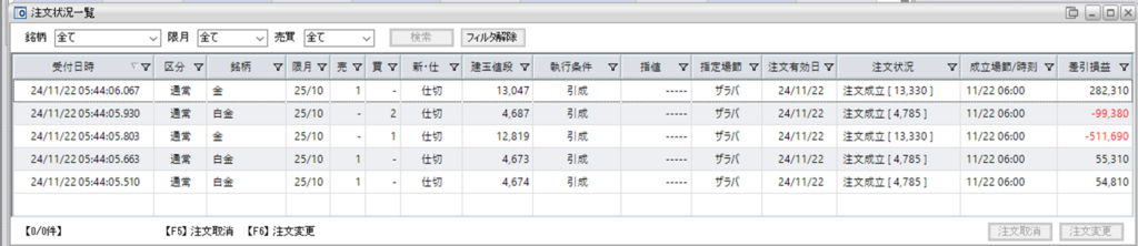 鞘縮小の仕掛け金売り1枚-白金買い2枚を同時に手仕舞いました。