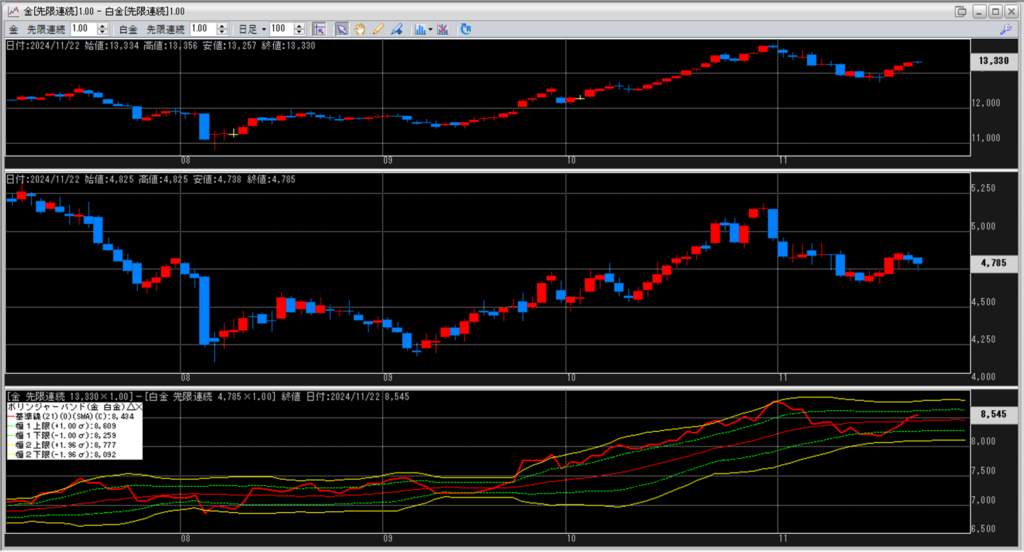 金白金の鞘をボリンジャーバンドで見ていきます。