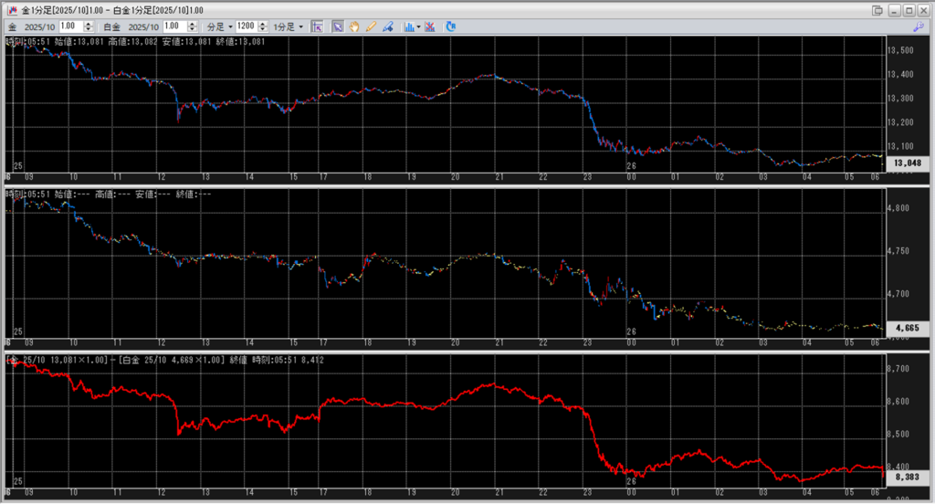 下:金白金鞘(金白金の価格差 = 金1グラムの価格 - 白金1グラムの価格)