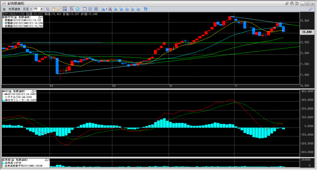 移動平均線の真ん中に位置している短期線13,123円を割り込んで、