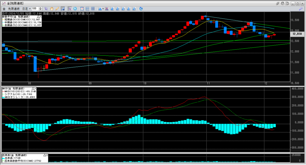 移動平均線の一番下に位置している短期線12,947円を割り込んで、
