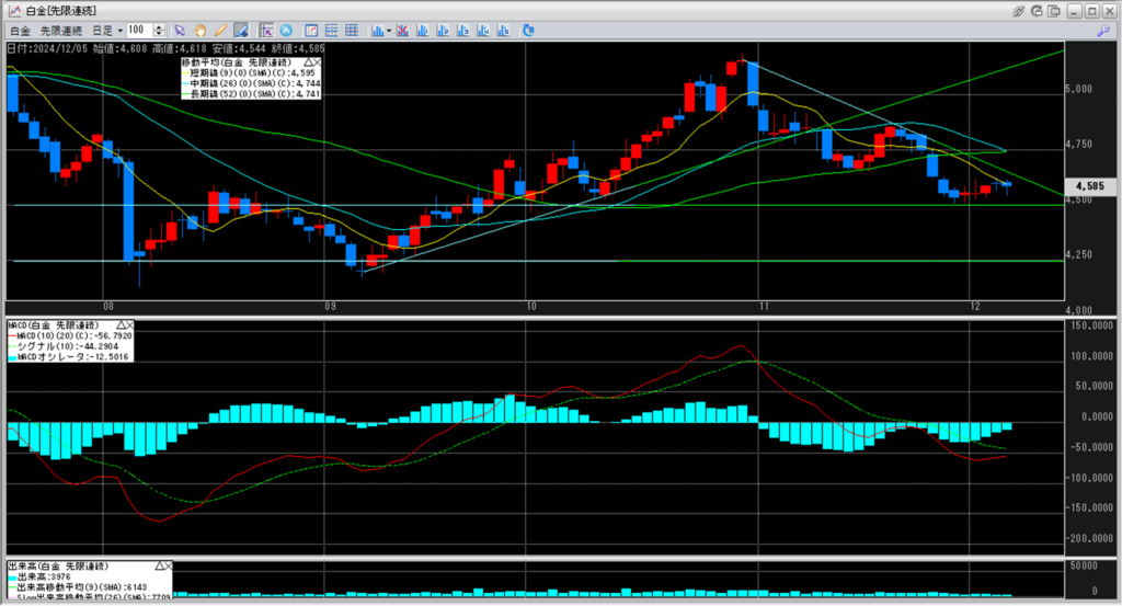 白金価格は上昇トレンドも全ての移動平均線も割り込み続けています。