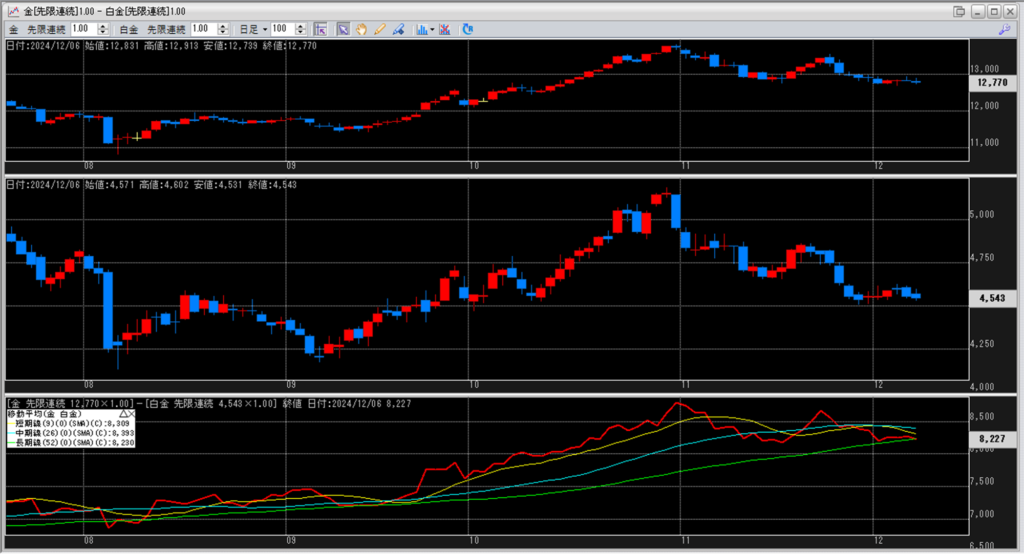 下記に金白金鞘の移動平均線のチャートを貼り付けています。