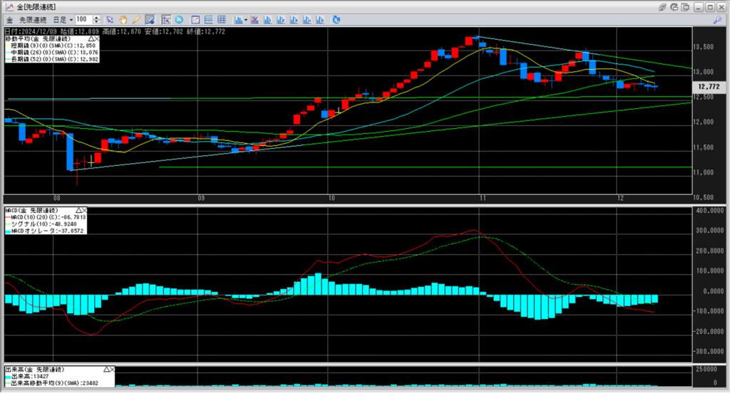 移動平均線の一番下に位置している短期線12,850円を割り込んで、