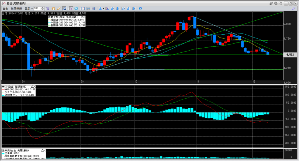 白金価格は上昇トレンドも全ての移動平均線も割り込み続けています。