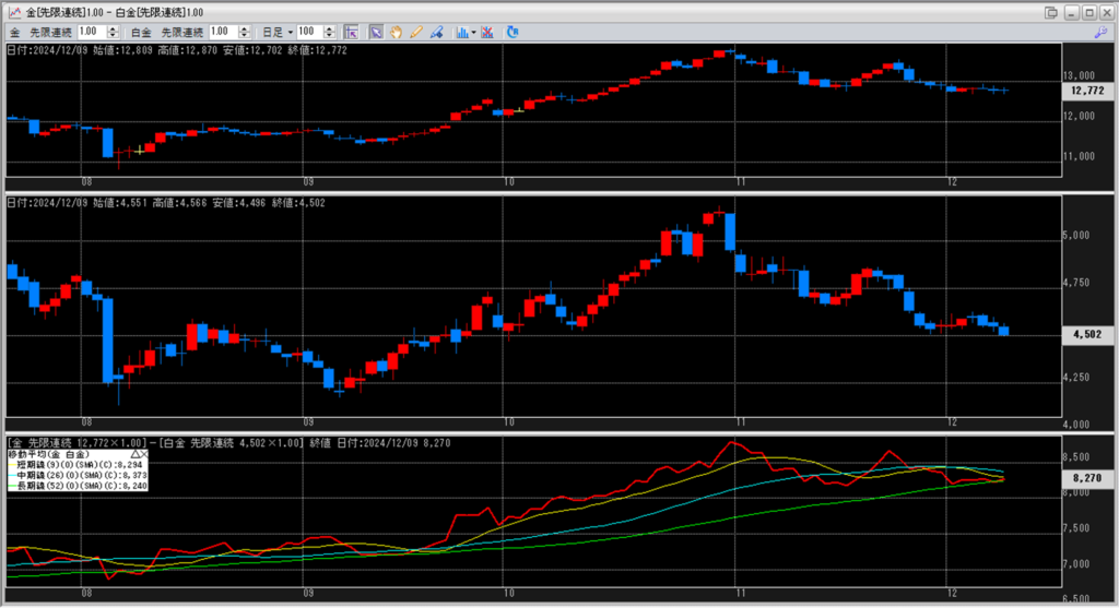 下記に金白金鞘の移動平均線のチャートを貼り付けています。