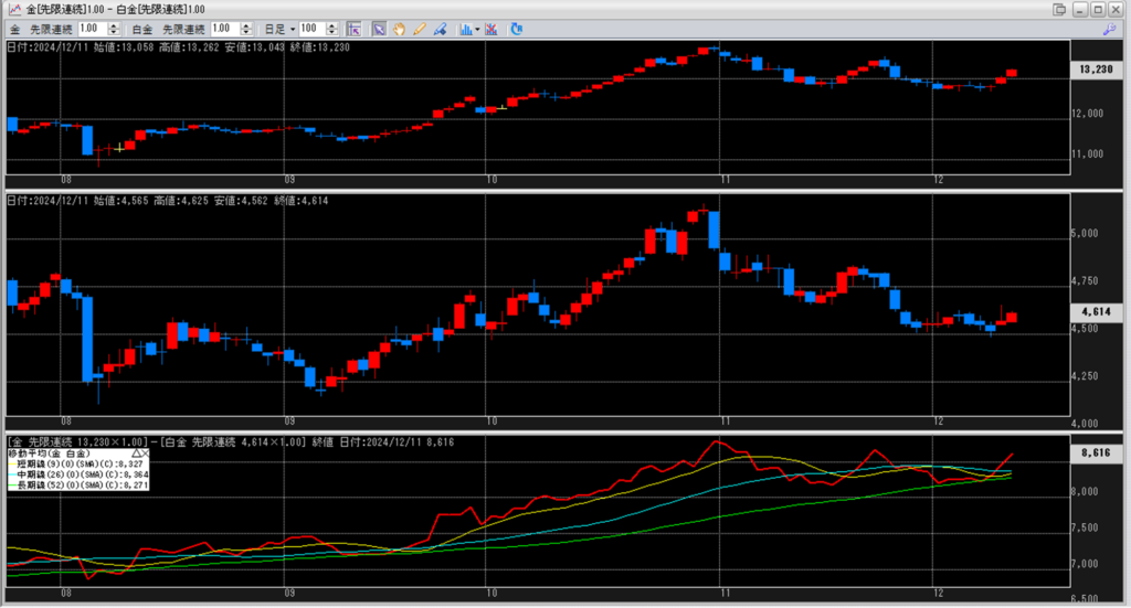 下記に金白金鞘の移動平均線のチャートを貼り付けています。