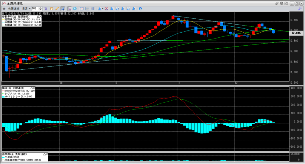 移動平均線の一番下に位置している中期線13,041円を割り込んで、
