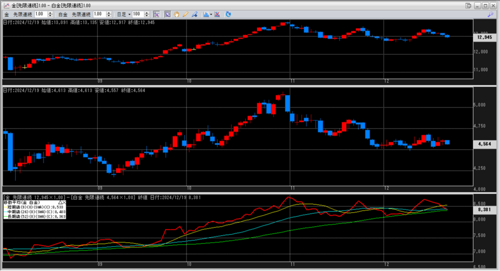 下記に金白金鞘の移動平均線のチャートを貼り付けています。