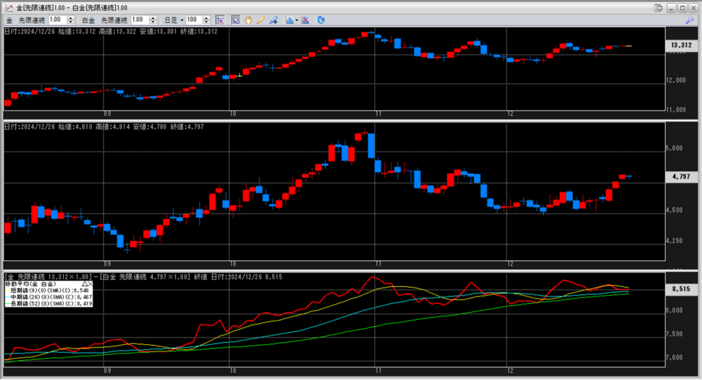 下記に金白金鞘の移動平均線のチャートを貼り付けています。