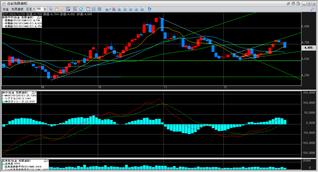 移動平均線の中で真ん中に位置している短期線4,706円を割り込んで、
