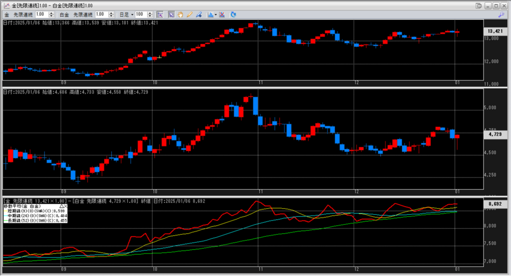 下記に金白金鞘の移動平均線のチャートを貼り付けています。
