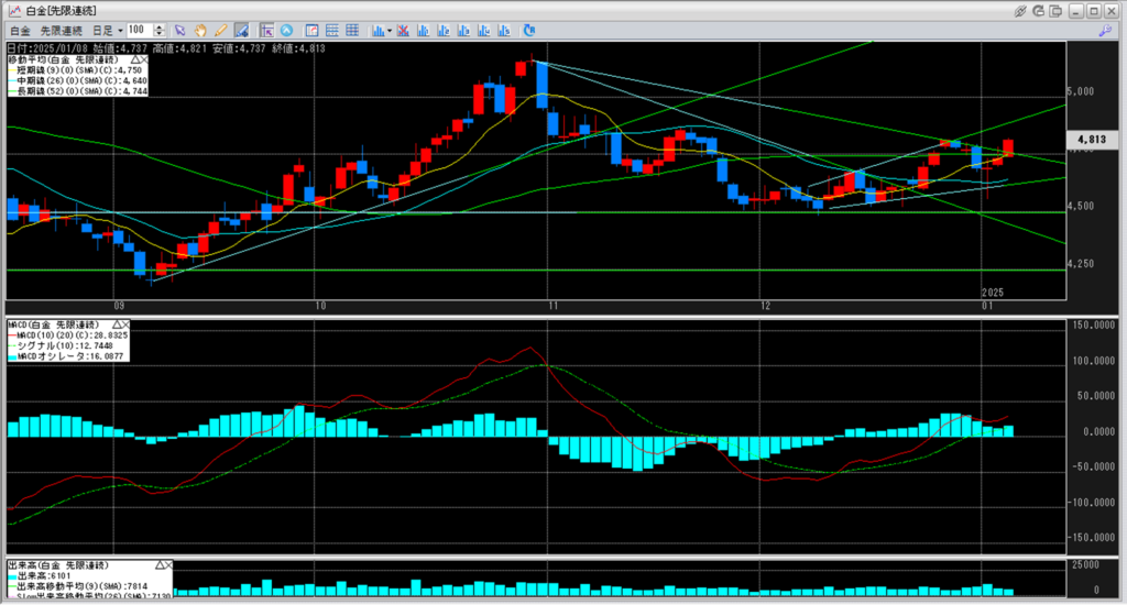 移動平均線の中で一番上に位置している短期線4,750円を越えて、
