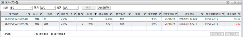 鞘拡大の仕掛け金買い1枚-白金売り2枚を仕掛けました。