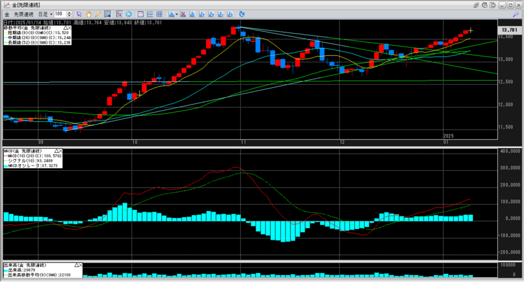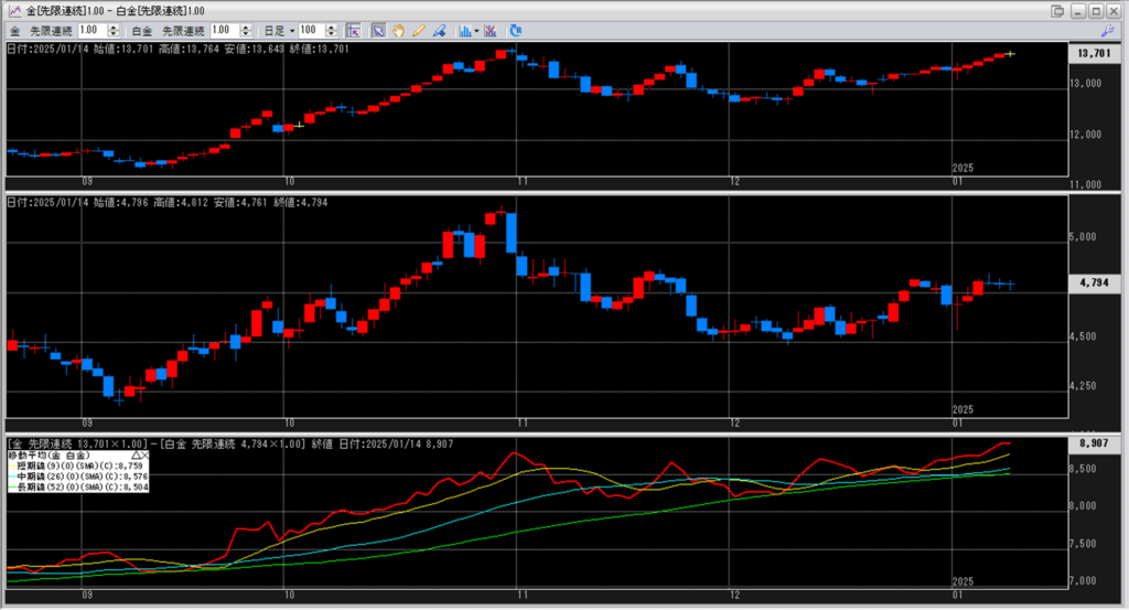 下記に金白金鞘の移動平均線のチャートを貼り付けています。