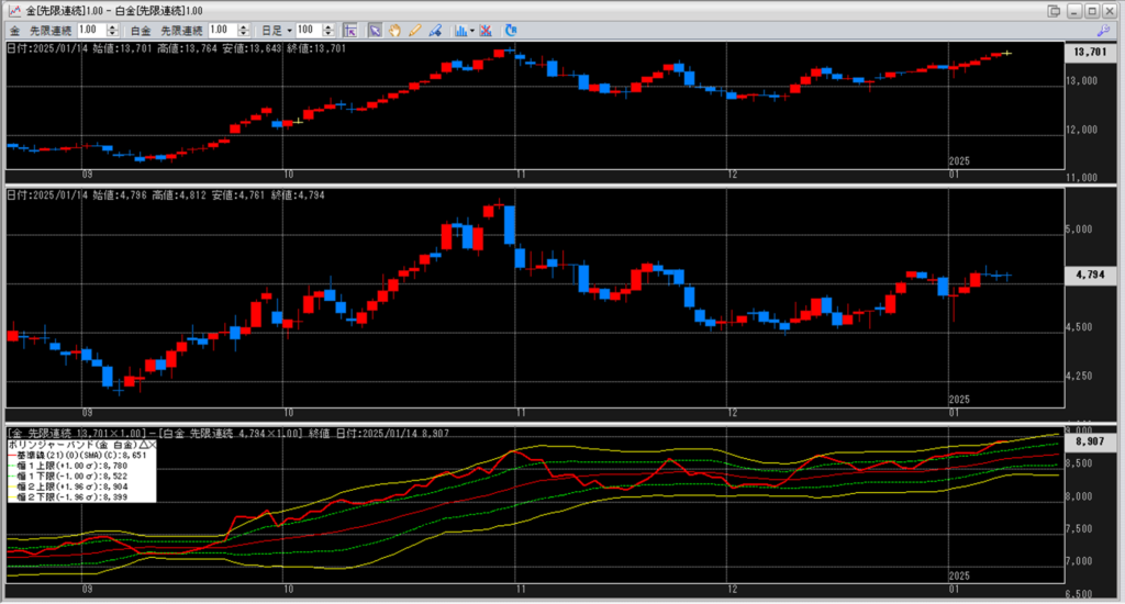 金白金の鞘をボリンジャーバンドで見ていきます。
