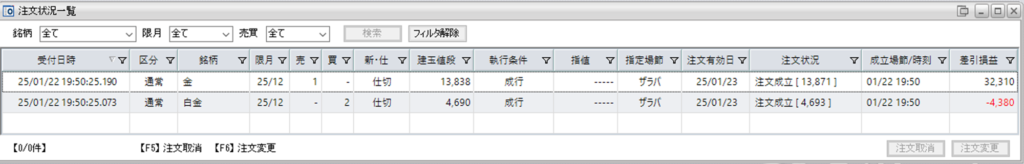 鞘拡大の仕掛け金買い1枚-白金売り2枚を建てました。