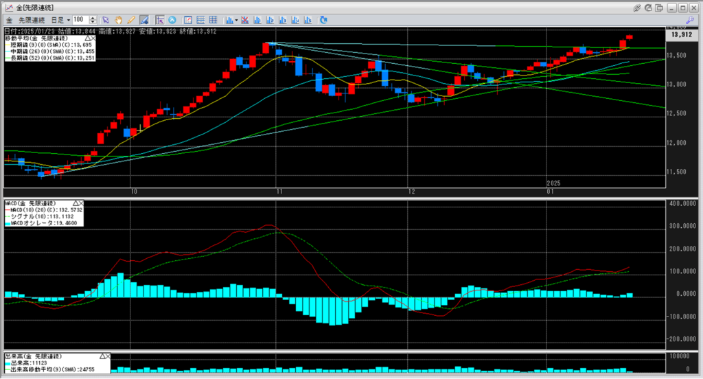 ボックス相場の上値である13,500円を超え続け、短期線も超え続けています。