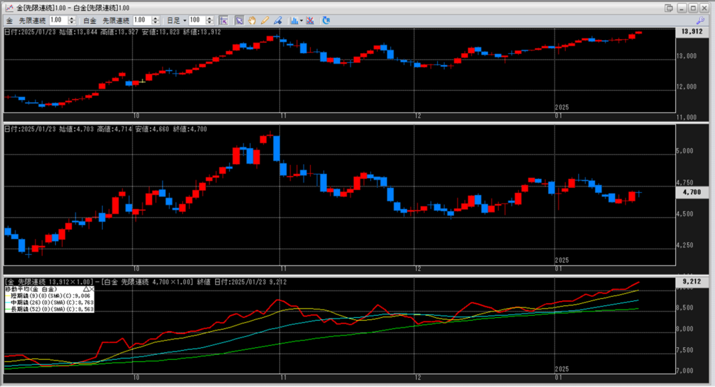 下記に金白金鞘の移動平均線のチャートを貼り付けています。