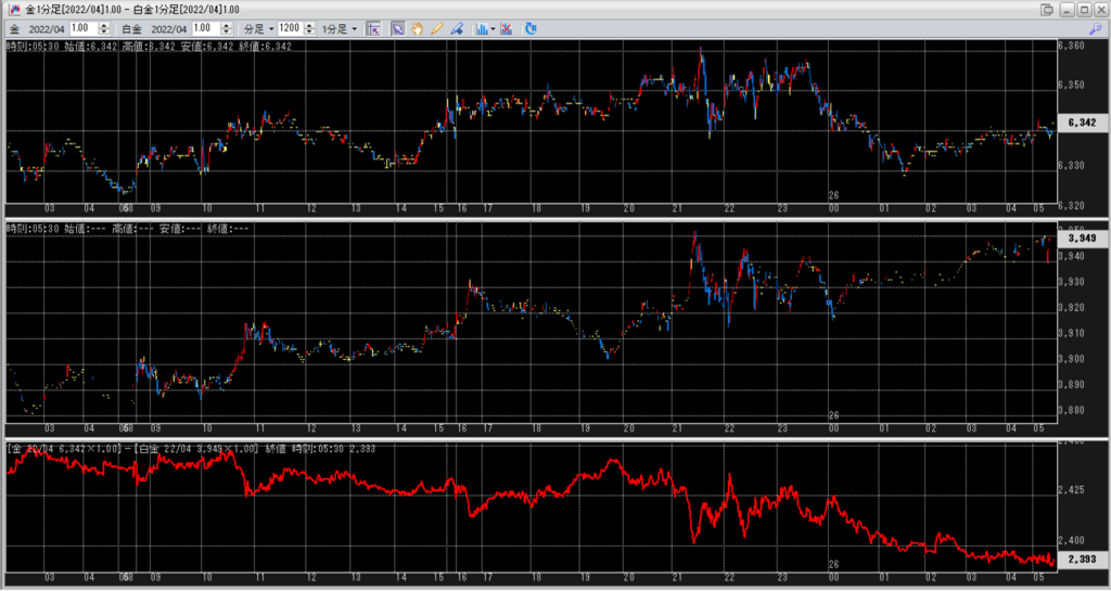 下:金白金鞘(金白金の価格差 = 金1グラムの価格 - 白金1グラムの価格)
