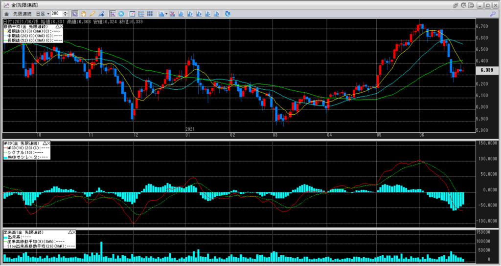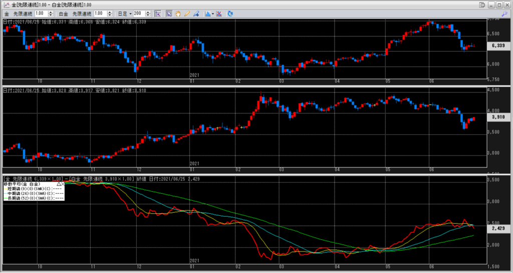 金白金の鞘の値段が短期線と中期線を下回っています。