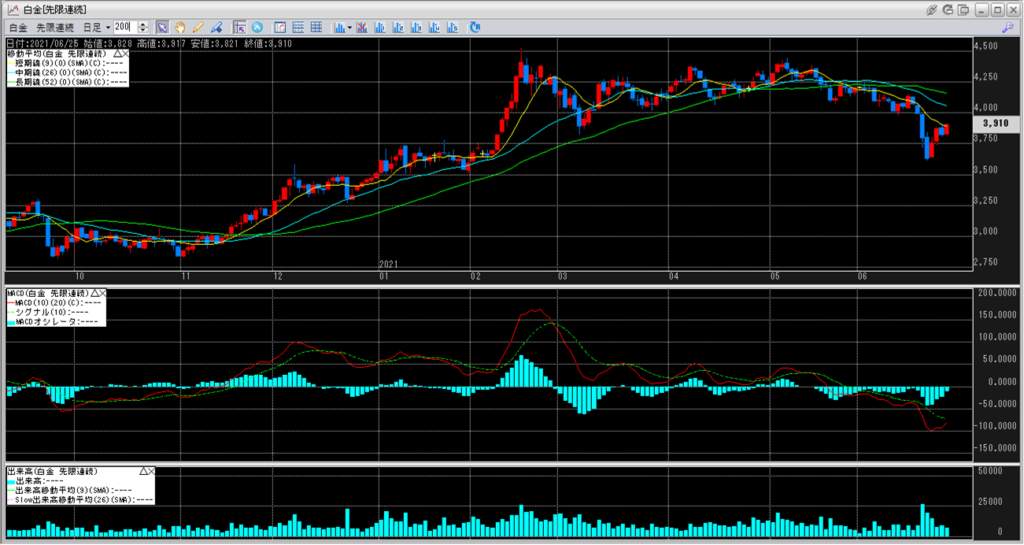2021年6月25日8:45~6月26日5:30 金白金鞘値動きのチャートを張り付けています。