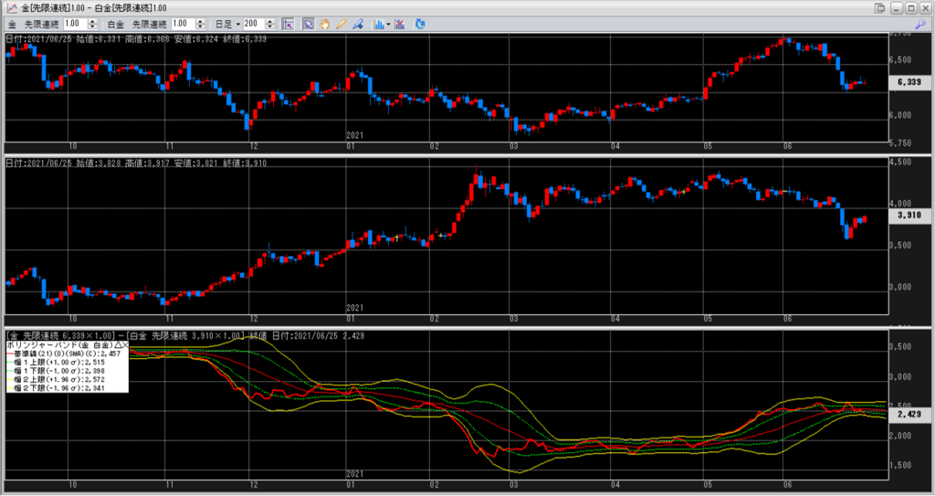 現在、チャート上の金白金の鞘の値段は2,424円くらいの-2σの少し上、2,429円となっています。