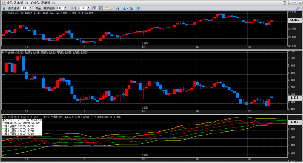 金白金の鞘をボリンジャーバンドで見ていきます。