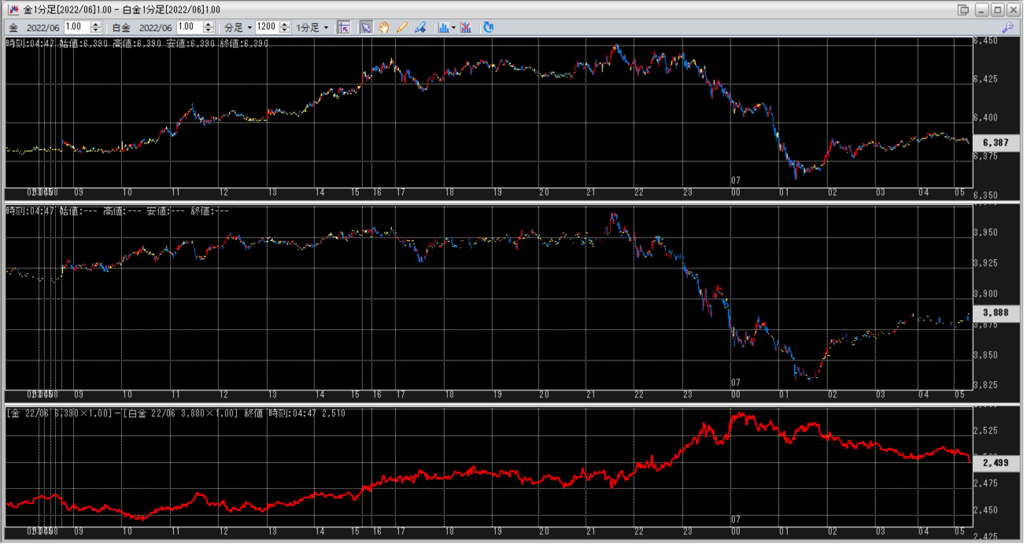 短期線2,467円と中期線2,513円の間で、金白金の鞘の値段が動いています。