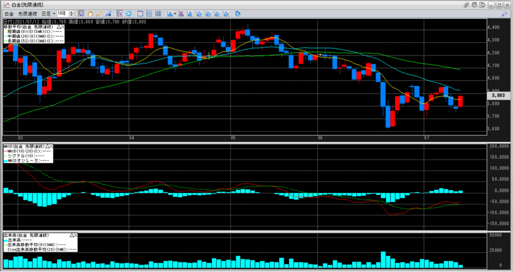 2021年7月9日8:45~7月10日5:30 金白金鞘値動きのチャートを張り付けています。