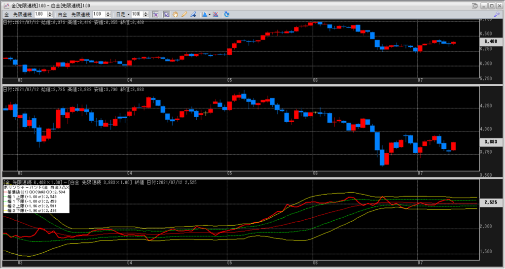 -1σで鞘拡大の仕掛け金買い1枚-白金売り2枚を仕掛けて行ければいいなと考えています。