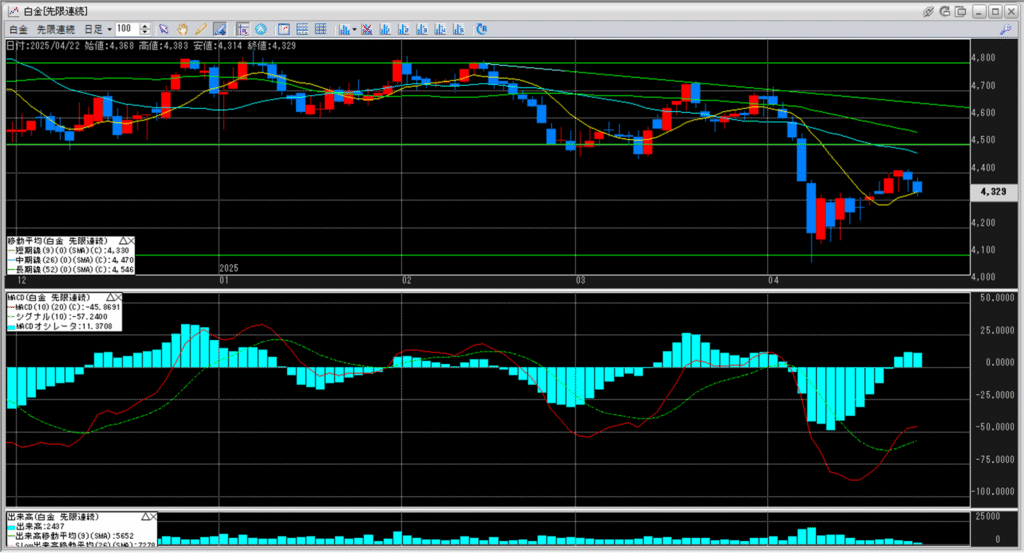 白金価格は上値4,800円、下値4,500円の間で値動きが続き、