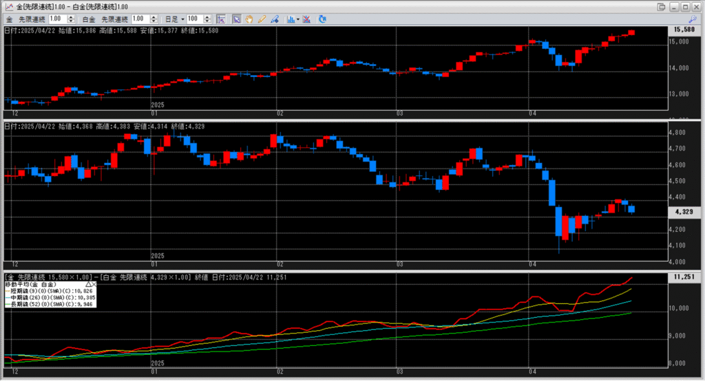 下記に金白金鞘の移動平均線のチャートを貼り付けています。