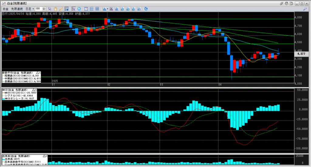 白金価格は上値4,800円、下値4,500円の間で値動きが続き、