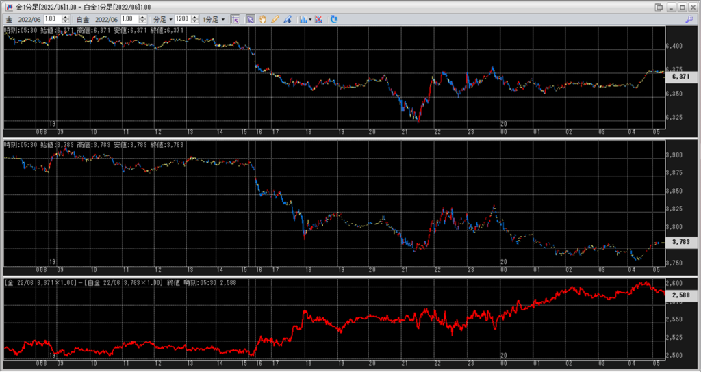結果論になりますが、鞘縮小の仕掛け金売り1枚-白金買い2枚を保持し続けていたら、