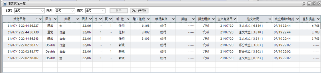下記に鞘縮小の仕掛け金売り1枚-白金買い2枚の手仕舞い結果を載せています。