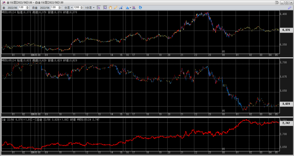 鞘拡大の仕掛け金買い1枚-白金売り2枚を増やしていくタイミングも見ていきたいと思います。