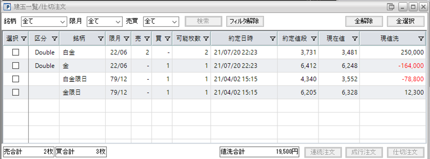 片張り金限日買い1枚と片張り白金限日買い1枚の含み損は約66,500円になります。