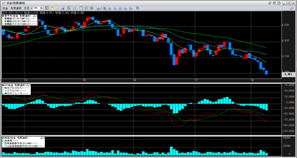 全ての移動平均線の下に、そしてだいぶ離れたところに白金価格は位置しています。