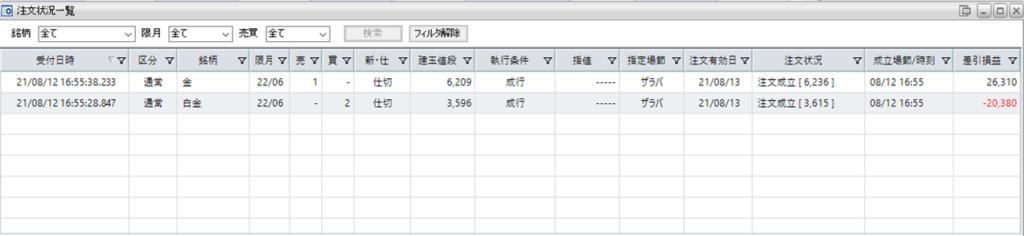 また、デイトレで鞘拡大の仕掛け金買い1枚-白金売り2枚を仕掛け、手仕舞っています。