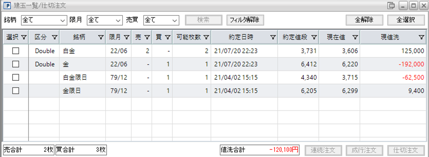 片張り金限日買い1枚と片張り白金限日買い1枚の含み損は約53,100円になります。