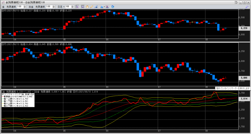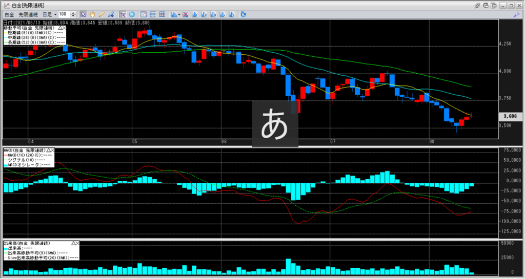 2021年8月12日8:45~8月13日5:30 金白金鞘値動きのチャートを張り付けています。
