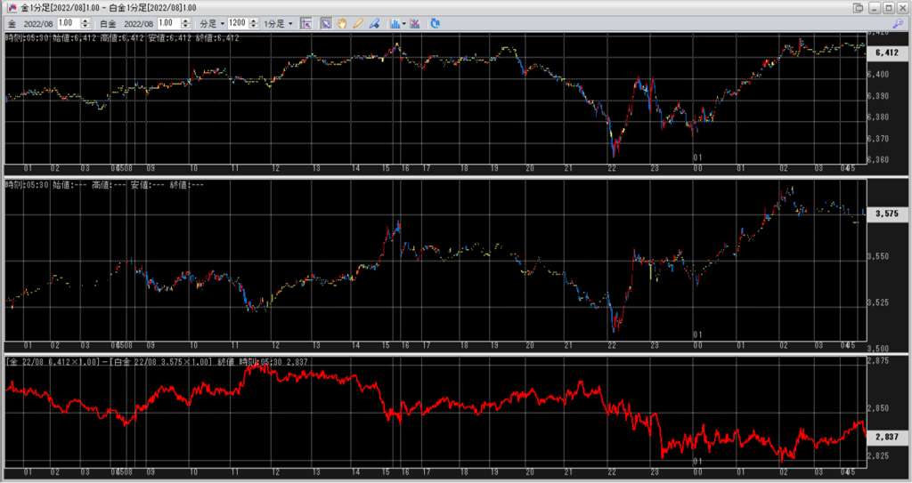 機会を待って、鞘拡大の仕掛け金買い1枚-白金売り2枚を仕掛けて行きたいです。