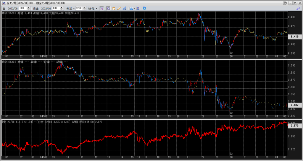 機会を待って、鞘拡大の仕掛け金買い1枚-白金売り2枚を仕掛けて行きたいです。