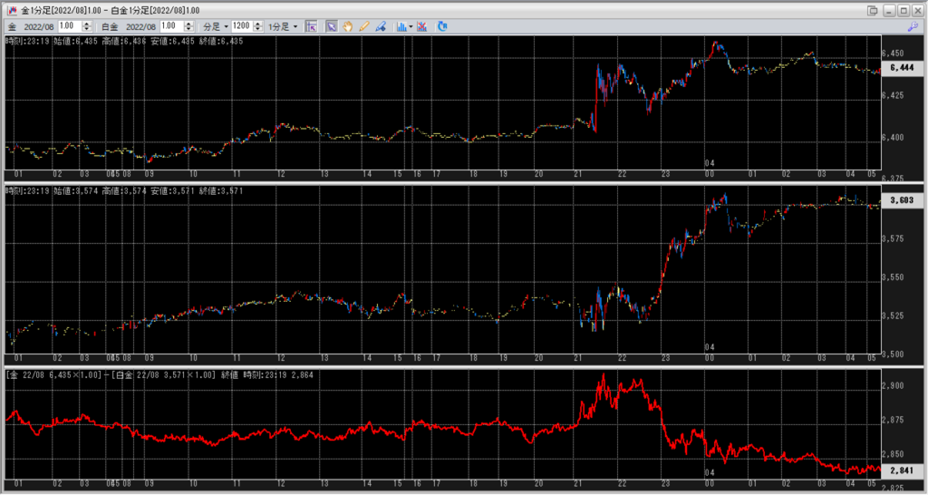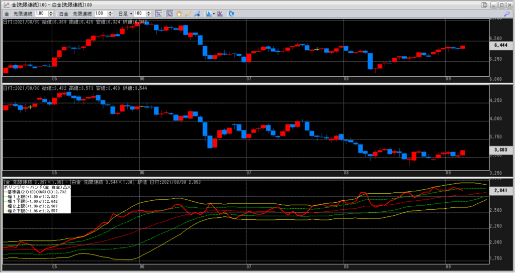 機会を待って、鞘拡大の仕掛け金買い1枚-白金売り2枚を仕掛けて行きたいです。